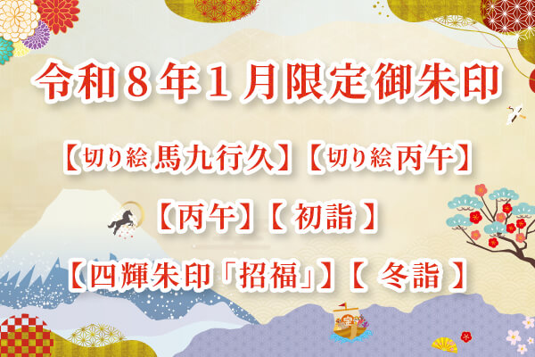 限定朱印「切り絵 馬九行久(うまくいく)」「限定 丙午(ひのえうま)」「四輝朱印 招福」など