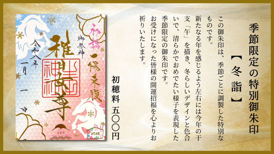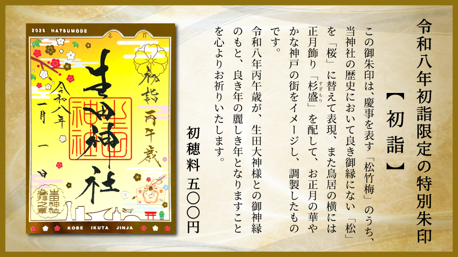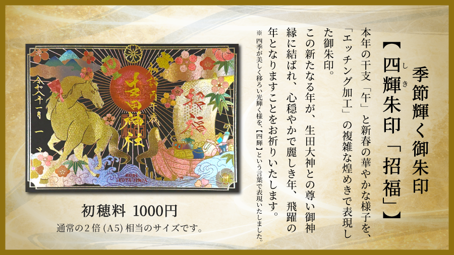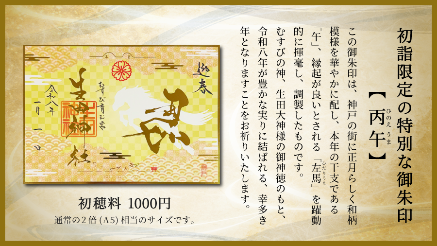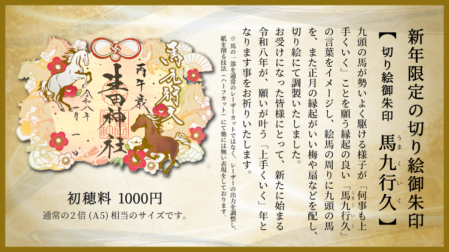 限定朱印「切り絵 馬九行久(うまくいく)」「限定 丙午(ひのえうま)」「四輝朱印 招福」など - 神戸の安産祈願・恋愛成就・ご縁結びは生田神社